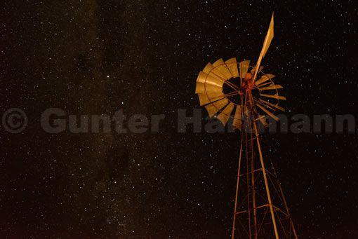 Sternenhimmel über Windrad auf Farm Ozondjisse, bei Omaruru